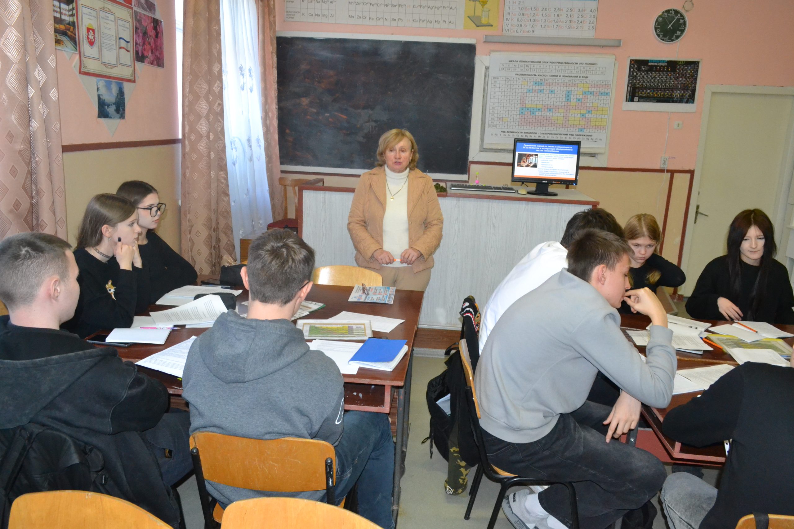 На занятии присутствовали представители работодателей: Никулина Светлана Петровна, специалист по охране труда, и Слепченко Светлана Алексеевна, специалист по осуществлению контроля, Бахчисарайского УЭГХ ГУП РК «Крымгазсети», которые одновременно выполняли обязанности членов жюри. Третьим членом жюри был Кутахин Павел Николаевич, мастер производственного обучения колледжа. Кроме того, занятие посетили Назаренко Н.В., преподаватель физики и физической культуры и Чертенкова Е.И., преподаватель математики.